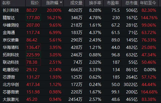 半导体设备概念股大面积高开,长川科技(维权)20%涨停,精智达、华峰测控、金海通等跟涨。